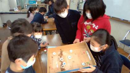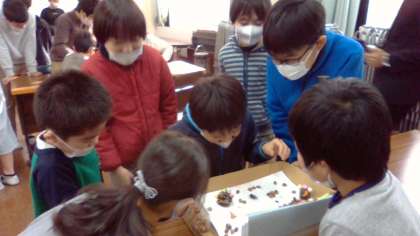 1年生が楽しい遊びを考えて,招待してくれました。どんぐり転がしやすごろくなどの遊びを6年生はとても楽しんでいました。ただ,遊んでるだけでなく,遊びながら,「こんなのよく作ったね。」など,1年生の頑張りを見ようとしている会話が聞こえてきました。また,一生懸命,遊び方を説明する1年生を微笑ましく見ている姿も見られました。どちらも楽しそうで,とても微笑ましい時間でした。