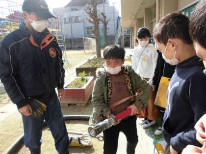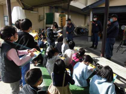 今日は,消防団の方に来ていただいて,乾消防団詰所を見せていただいたり,お話を聞いたりしました。