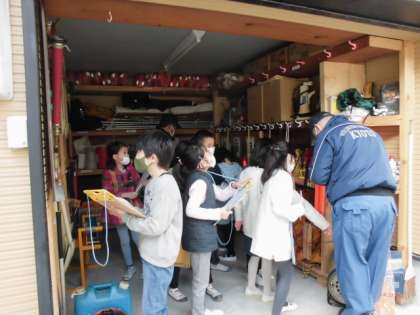 消防ポンプやたくさんのホースがあり,他にも道路を整備する点滅ライト,ライフジャケットなどもあり,それがどんな時に,どのように使われているのかなどについてお話を聞きました。