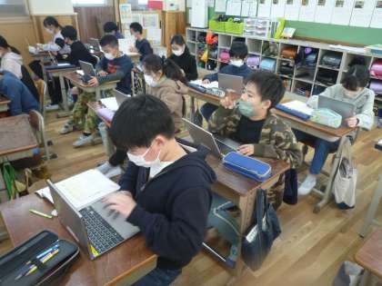 音楽の授業でパソコンの「バーチャルピアノ」の機能を使って,旋律づくりをしました。パソコンの画面にピアノの鍵盤がでてきて,押すと音がなる仕組みになっています。どんな旋律の音楽ができるのか楽しみです。