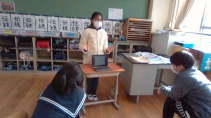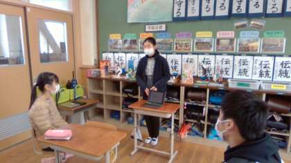 資料を効果的に使うことを意識してスピーチをしています。最後の参観で,一人ひとり発表する予定です。昨日は,リモートで,ZOOMのブレイクアウトルームを使って3人組に分かれ,聞き合いアドバイスし合ったので,今日は,メンバーを変えて,目の前の人を意識して,スピーチしました。