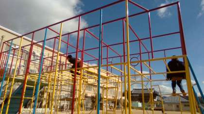 児童が少なく静かでどこか寂しさを感じる校庭。総合遊具で遊んでいる児童の他に,腰をかけてのんびり過ごす児童の姿も。