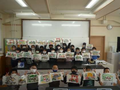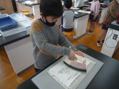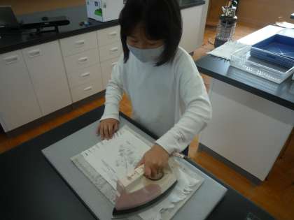 先日持ち帰りました友禅染の仕上げの様子です。洗いをかけて,乾かした後,アイロンをかけました。初めて使うアイロンがけに慎重に取り組んでいましたが,とても綺麗にすることができました。完成した作品を見て,嬉しそうな表情で持ち帰りました。