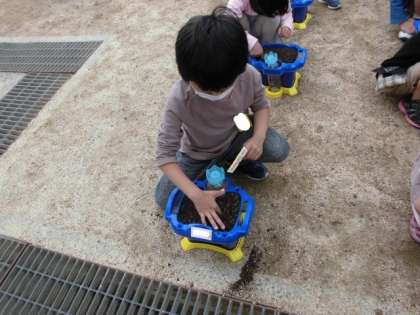そっと指で穴を開けて,朝顔の種を5つまきました。