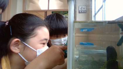 たくさんの卵のうち,既にふ化して赤ちゃんメダカになっているのもあったので,