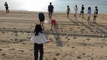 無事に慶野松原荘に着きました。入館式の後,宿舎のすぐ裏の浜辺に行きました。