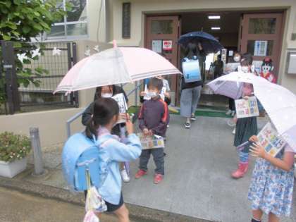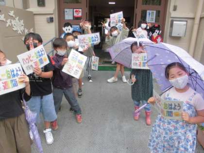 雨にも負けずハッピーおはよう週間のあいさつ運動をがんばりました。元気いっぱいの気持ちの良いあいさつをしていました。「おはようございます」のあいさつで,気分よく一日をスタートできます。