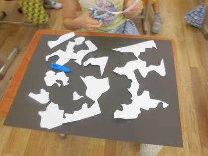 図画工作科で「はさみのアート」の作品を作りました。紙をジグザグに切ったりぐるぐる丸く切ったり、自由に切ってできた形をならべてみました。縦に置いたり横に置いたりしてならべてみると、いろいろなものに見えてきました。切った形から、たくさんの世界が広がりました。