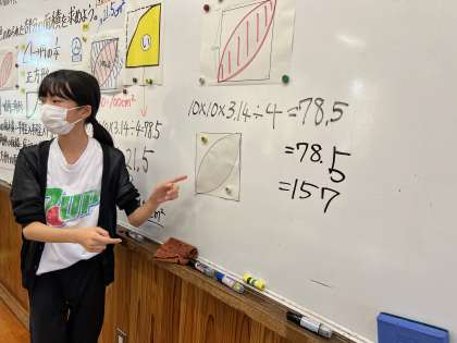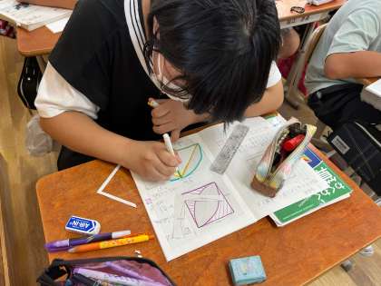 円の面積の学習をしています。色の塗られた部分の面積をどのように工夫して求めるのか、クラスで話し合い、求め方を考えました。これまでの学習で学んだことを生かして、工夫して面積を求めることができました。また、一つの考え方だけではなく、いくつかの考え方で求めることができていました。よく頑張りました。