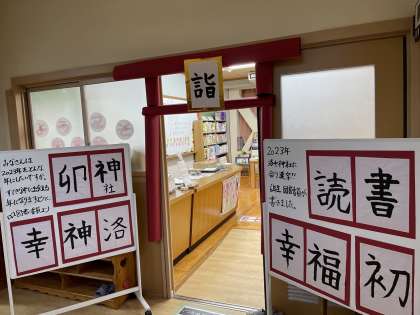 今年は図書室に鳥居も作り、入り口には6年生の図書委員が書いた、洛中神社に合う漢字を飾っています。鳥居の上には図書委員の投票で選んだ漢字を飾りました。