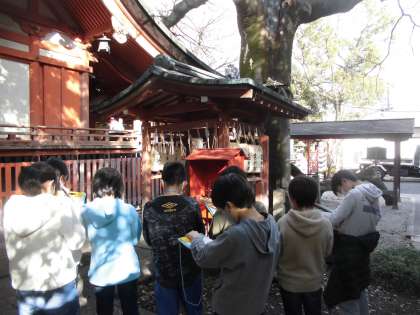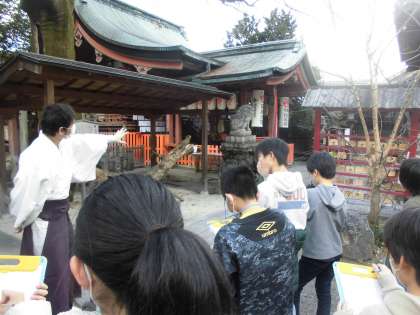 こちらは武信神社の見学の様子です。宮司さんが子どもたちにわかりやすく説明をしていただきました。観光客の方が「カーナビ通りに来ても武信神社にたどり着けない」というお話を聞いて何かできることはないかなと考えていました。自分たちにできることも考えながら、まとめていきます。