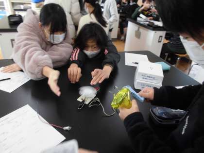 その電気が遠くの発電所から届いていることを知り、理科室にある手回し発電機やソーラーパネルを使って、自分で電気を作ることに挑戦しました。また、コンデンサーで電気をたくわえ、乾電池と同じように使うことができるかどうかも調べました。