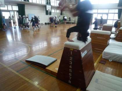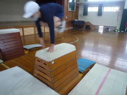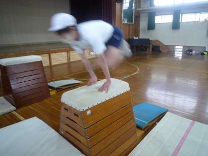 体育の学習でとび箱運動をしています。これまで開脚跳びはできたけど台上前転やかかえ込み跳びができなかった子がたくさんいたので、技のコツを掴む練習をしました。すると、クラスのほとんどの子ができるようになりました。「これまでできなかったけどできるようになって嬉しい。」と話していました。とび箱が得意な子は首はね跳びや頭はね跳びにも挑戦しています。