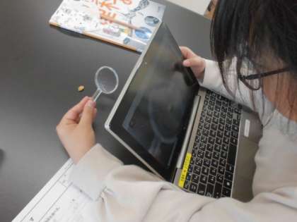 「アサガオの種と比べると大きいな。」「だいたい1cm3mmくらい。」「よく見ると茶色と黄土色が混じってる。」「ピーナツみたい!」「このへん触ってみるとチクチクしてるよ。」…たくさんの気づきを交流して、記録できました。