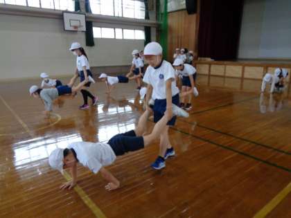 5年生は体ほぐしの運動で、手押し車をしました。
