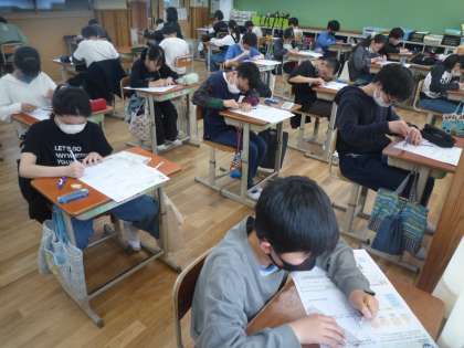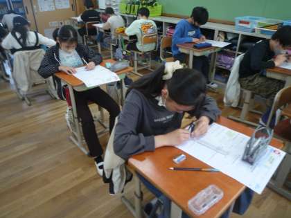 対称な図形のテストをしました。丸をつけて、返却をしました。テストファイルに綴じて、ふりかえりを書きました。お家の方からコメントをもらうように伝えています。お手数ですが、ご記入よろしくお願いします。5月8日(月)に持たせてください。子どもたちよく頑張っていました。