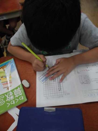 今日は、表をもとに棒グラフを書き表す学習をしました。一目もりの大きさに気をつけながら、定規を使って丁寧に書くことができていました。