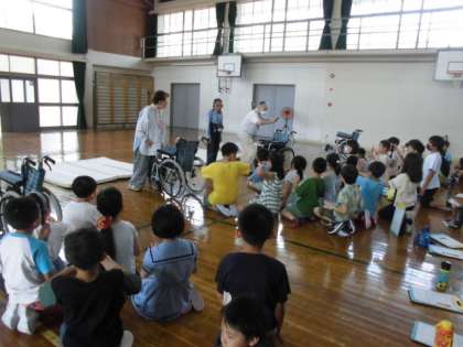 総合的な学習の時間に、身体障害者の方の気持ちを考える学習として、車いす体験をしました。