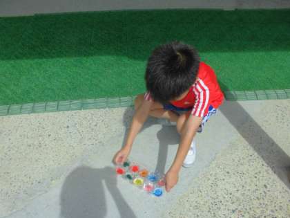 図画工作科で「ひかりのプレゼント」の学習をしました。お家から持ってきたペットボトルや瓶などの材料と、色ペンやスズランテープ、絵の具、水などを組み合わせて光に当ててみると、キラキラ光ってきれいでした。