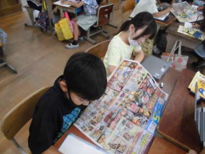 今日の学習では、スーパーマーケットのチラシ広告をもとに、商品がどこから運ばれてくるのかを調べました。