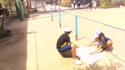 その後は運動場に出て、いつも水たまりがあるところにビニールのシートを敷いて水を流して水の流れ方を確認しました。