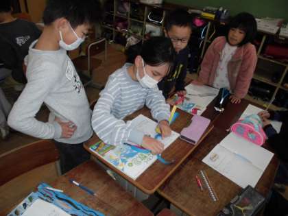 算数科では「分数」の学習がスタートしました。1mの青いテープをもとに、それより短い黄色のテープと赤いテープの長さをどのように表せばよいかを考えました。グループでは、青いテープを他の2つのテープの長さに折る活動をしました。半分には折れるものの、もう一本をどう折ればよいか、友達と試行錯誤する様子が見られました。結果、赤いテープは青の2分の1、黄色のテープは青の3分の1ということを活動の中から見つけることができました。