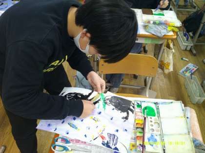 図工の学習で取り組んできた版画が完成しました。題材は国語の学習で取り組んだ「やまなし」です。自分の感じたやまなしの世界観を版画に表現しました。1〜6年生の学習で取り組んできた技法を使って作成しました。作品展で掲示しますので、楽しみにしていてください。