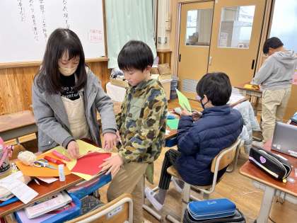 6年生の卒業祝いのメッセージカードを作っています。たてわりの集合写真を付けた特製のメッセージカード♪相談しながら丁寧に作ってます