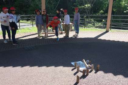 山から下りてきて休憩が終わったらモルックをして遊びました。ボーリングのようにピンを倒して遊びます。二つのグループに分かれて時間いっぱい楽しみました。