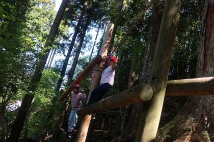 部屋をきれいにした後に冒険の森(アスレチック)に行きました。怖い気持ちと闘いながら一つ一つ乗り越えていきました。途中にはターザンロープもあり校長先生が後ろからおしてくださりました。ほかにも,ゆらゆら橋や一本丸太などドキドキするアスレチックがたくさんあり子どもたちはめいいっぱい楽しみました。