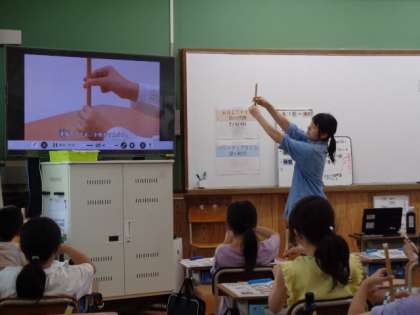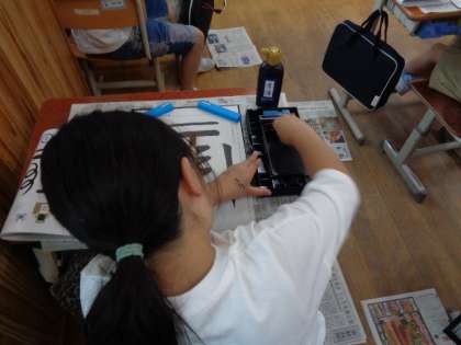 書写の授業が始まりました。習字セットの中身を確認し、名前や使い方を確認しました。集中して取り組むことができました。