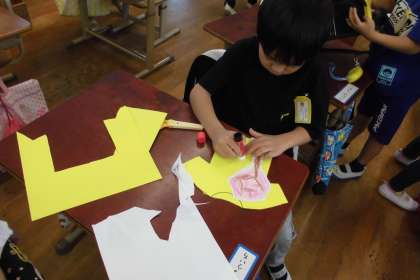 いろんなものを想像して、思い思いに色画用紙を破いては、「新幹線に見えるよ!」「これはね、人だよ」など、子どもたちの想像力の豊かさを感じました。