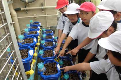 体育の学習が終わった後に、あさがおを見ていた子どもたち。植木鉢から芽が出ているのを発見。みてみて!と大きな声で喜んでいました。