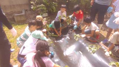 今日は畑の先生、水上先生と竹田先生がさつまいもの苗を持ってきてくださいました。初めにさつまいもの育て方について説明していただき、畑に苗を植えに行きました。いしょくごてで深く掘って、そーっと植えました。2年生の力ではなかなか深く掘れず、引っ張るとすぐに抜けてしまうので、先生に手伝ってもらいながら全員植えることができました。