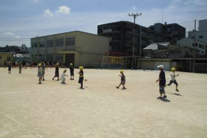 あさがおの様子を見に外に出てみると、6年生のお兄さんとドッチボールをする1年生の姿がありました。大きな声を出しながら、全力で楽しんでいる様子でした。