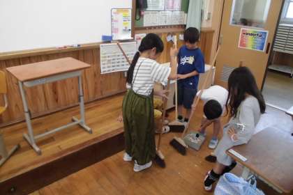 掃除の時間に、5年生がお手伝いに来てくれました。1年生の子どもたちもそうじの仕方がわかってきていたところに、もっとテキパキできる方法を教えてもらって、スムーズに掃除ができるようになりました。5年生の皆さん、ありがとう!