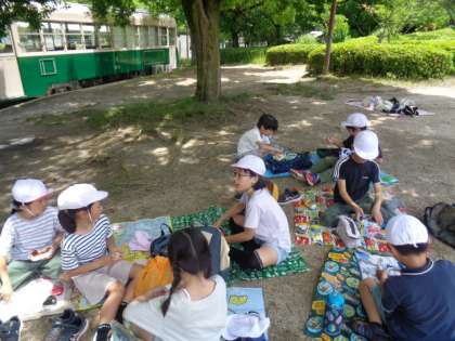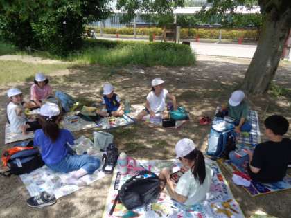 いよいよ子どもたちが楽しみにしていたお弁当の時間です。それぞれのお弁当を紹介し合ったり、自然の中で食べる良さを味わったりしながら美味しくいただきました。