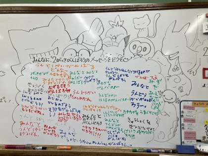教室では、宿題を集めた後、ホワイトボードに2学期がんばろうねのメッセージを子どもたちに書いてもらいました。色々と頑張りたいことがあるようです。かわいらしいなと思いました。学活と国語の時間を使って、夏休みの思い出を輪になった友達とお話し会をしました。いっぱい話してくれる子どもたちの表情や話の速さから、楽しかったことやうれしかったこと、色んなことを感じたことが分かりました。