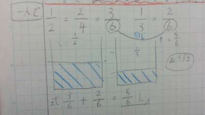 5年生は分数の学習を進めています。約分や通分ができるようになり、2分の1+3分の1のように分母のちがう分数を足すときには、分母をそろえるために通分すればよいことを説明しあいました。