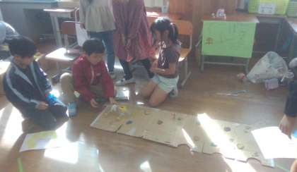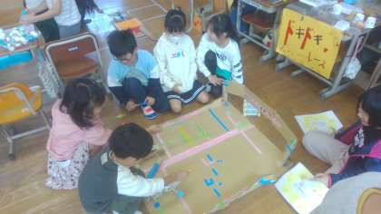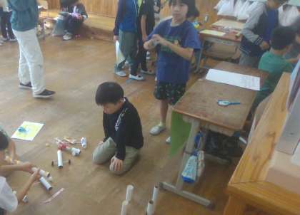 「でこぼこ車レース」チームはペットボトル、段ボールを使って磁石で動く車と障害物のあるコースを作りました。「ドキドキレースや」チームは輪ゴム、クリップ、ペットボトルなどを使ってゴムの力で動く車を作りました。「たいほうでものをたおすやさん」チームはラップのしん、輪ゴム、ペットボトルのキャップなどを使って色々な種類の大砲を作り、トイレットペーパーの芯に当てて遊ぶコーナーを作りました。