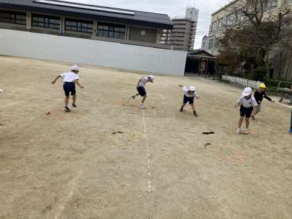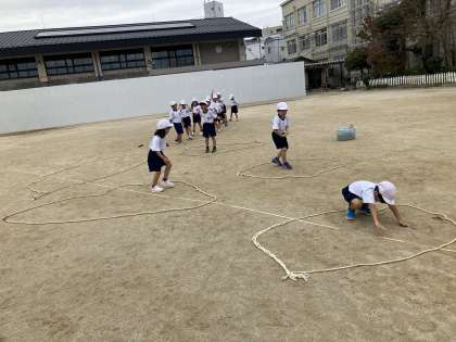 体育では、とびあそびをしています。大縄をしたり、大縄で島を作って渡ったりして、体を動かしています。子どもたちもジャンプのタイミングや、自分が飛び越えられる距離を考えながら、取り組んでいるように感じます。