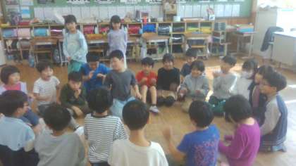 学級会でみんなでしたい遊びを決めてからパーティーをしました。今回は「リーダーゲーム」と「だるまさんがころんだ」と「なんでもバスケット」をして遊びました。