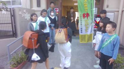 計画委員の5、6年生が正門に立ち、よんきゅうあいさつ運動を行いました。登校してくる洛中小学校の友達に笑顔で挨拶をしていました。