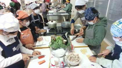 あじわい館では、聖護院大根、金時にんじん、九条ネギや壬生菜、京丹波黒本しめじなど新鮮な京野菜をたっぷり使って「豚肉となすのケチャップいため」「みぶ菜の和風サラダ」「すいとん汁」を作りました。3品もありましたが栄養士会の方々に教えてもらいながら、みんなで協力しておいしい料理を作ることができました。