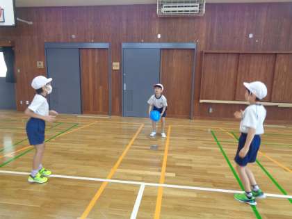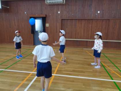 体育では、からだほぐしの運動をしています。今日はクラスみんなでじゃんけん列車をしたり、チームで風船バレーをしたりしながら体をほぐしていきました。