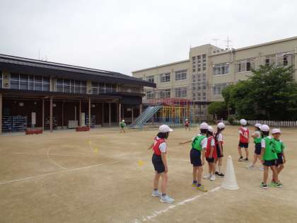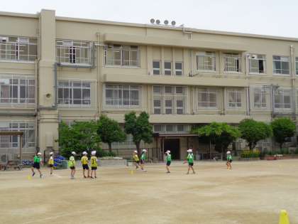 体育では、チームでバトンをつないで走ることを楽しんでいます。チームのタイムが少しでも速くなるようにバトンパスを工夫したり、コーナーを走り方を工夫したりして取り組んでいます。