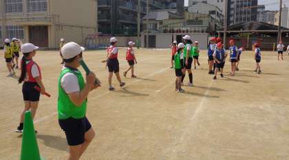 体育科ではリレーの学習が始まりました。まず初めに、チームでバトンパスの練習をしました。「右手でもらって、左手でバトンを渡す。」「バトンをもらうときは、相手を信じ、前を向いておく。」など大切なことを確認してから、練習に取り組みました。練習中、バトンを渡す時に、「はい!」と声を出して渡すなど、工夫して取り組んでいる姿も見られました。これからもっとスムーズにバトンが渡せるように練習していきます。