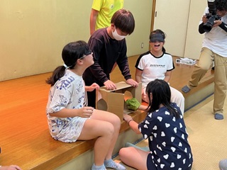 続いては、目隠しをして箱の中に何が入ってるか当てるクイズをしました。全員が前のめりになって夢中になりました!