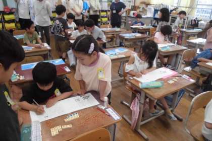 この時間は、子どもたちの幼稚園・保育園・子ども園からも先生方が参観に来てくださり、ドキドキする中、自分のノートを一生懸命きれいに書いたり、自分のことが終わったらお友だちにお助けに行ったりする姿が見られました。