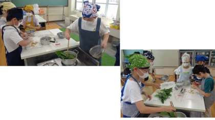 今日の3、4時間目に家庭科の実習を行いました。今回は、じゃがいもとほうれん草をゆでました。ゆでる前のほうれん草の色とゆでた後の色は違うことや、触り心地も変わったりすることに気づいていました。じゃがいもは、ほうれん草よりもゆでる時間がかかることを初めて知った子どもたちもいました。今回学習したことを、お家でも実践してみたい、という子どもたちもいたので、ぜひ調理してみてほしいと思います。